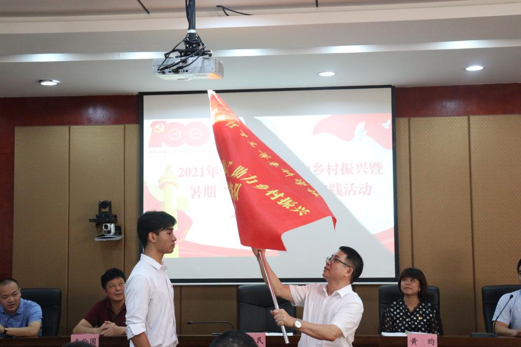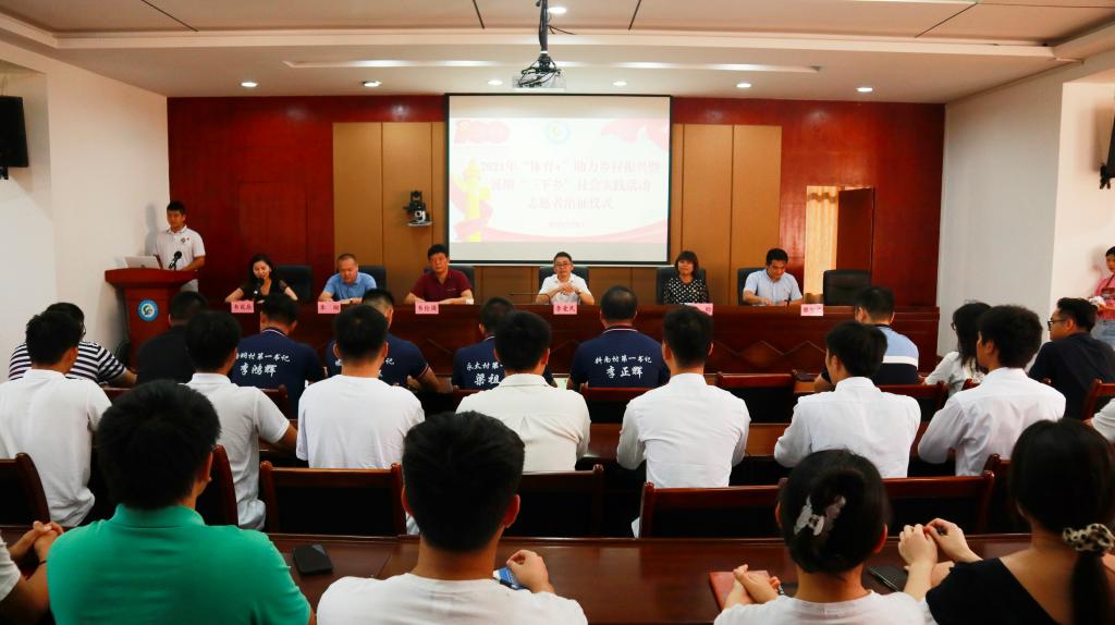 团委书记黎智达首先介绍本次社会实践活动的具体情况并作动员讲话。党委副书记李爱民、党委组织部部长黄昀分别为2021年“体育+”助力乡村振兴暨暑期“三下乡”社会实践活动志愿者服务队队长、队员授旗。
