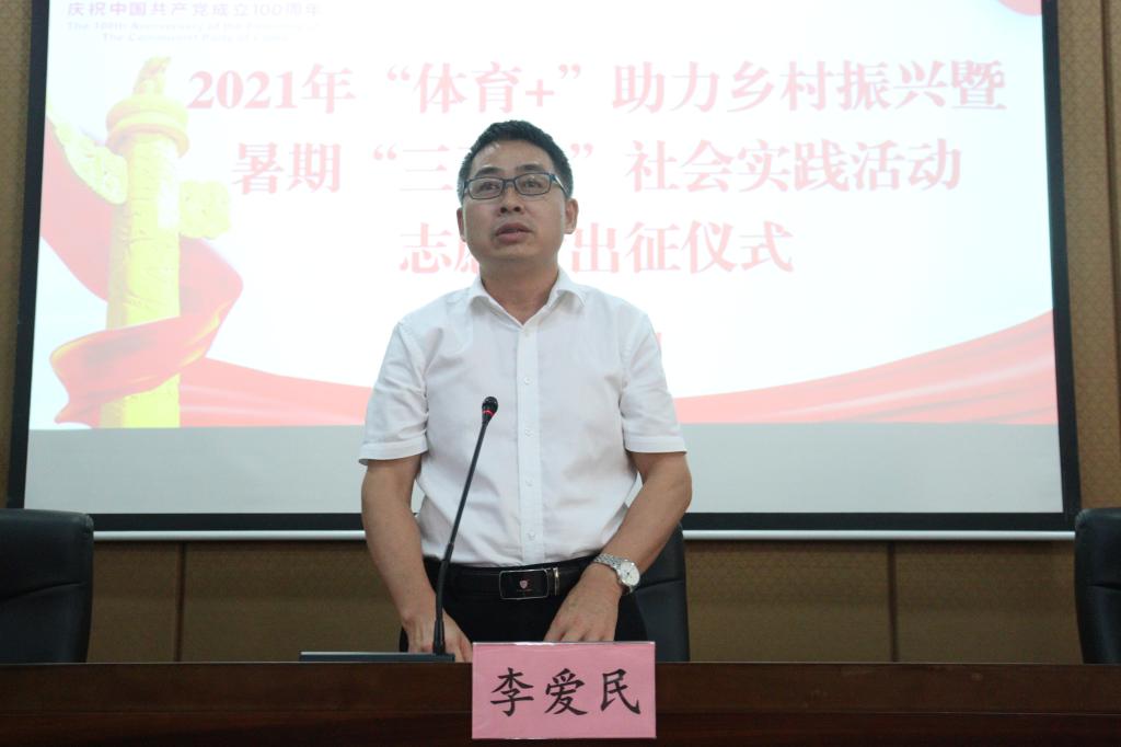 7月9日下午,爱体育电子官方网站2021年“体育+”助力乡村振兴暨暑期“三下乡”社会实践活动志愿者出征仪式在爱体育(中国)七楼报告厅举行。校党委副书记李爱民、党委组织部黄昀、学生工作处韦伦国、爱体育(中国)团委书记黎智达出席仪式,驻村第一书记、各学院团委书记、负责人以及志愿者代表参加了此次仪式。仪式由团委副书记韦宛辰主持。