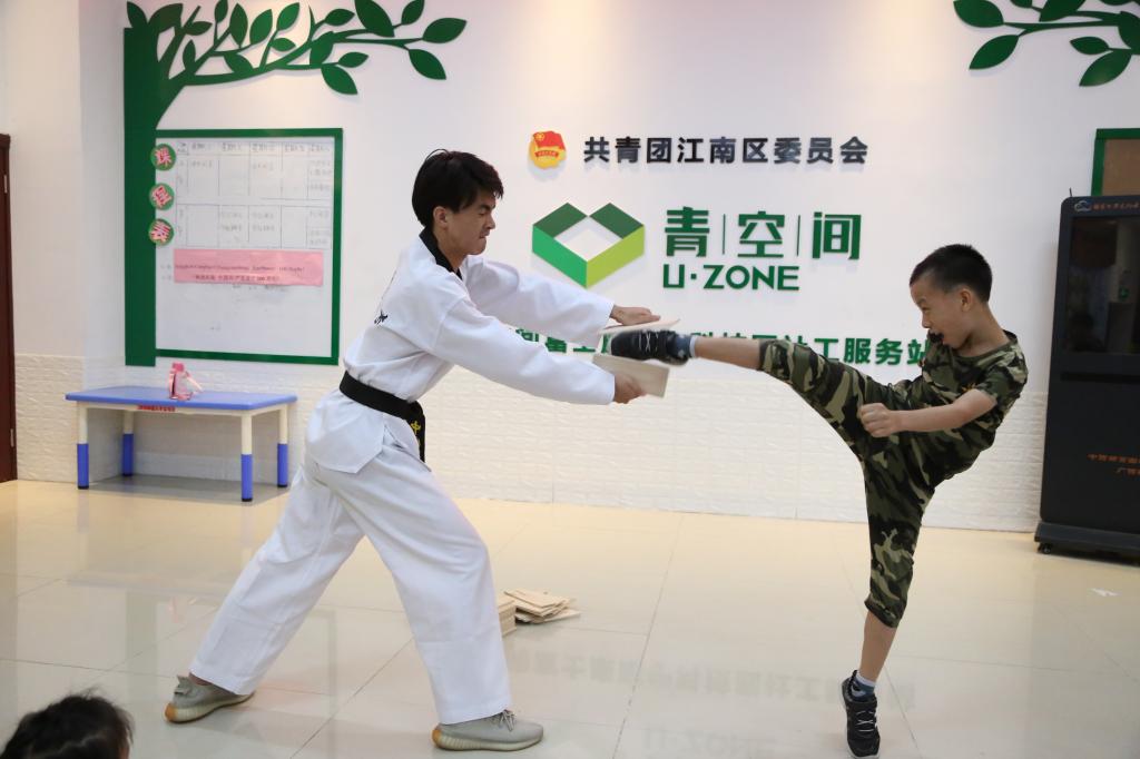 大学生志愿者正在富士康教跆拳道