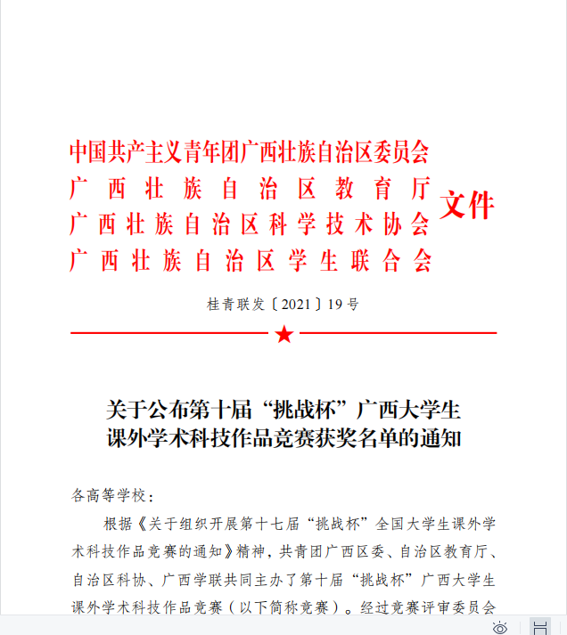 近日,由共青团广西区委、自治区教育厅、自治区科协、广西学生联合会共同主办的第十届“挑战杯”广西大学生课外学术科技作品竞赛结果公布。爱体育电子官方网站首次参加“挑战杯”广西大学生课外学术科技作品竞赛,荣获2个二等奖、4个三等奖。