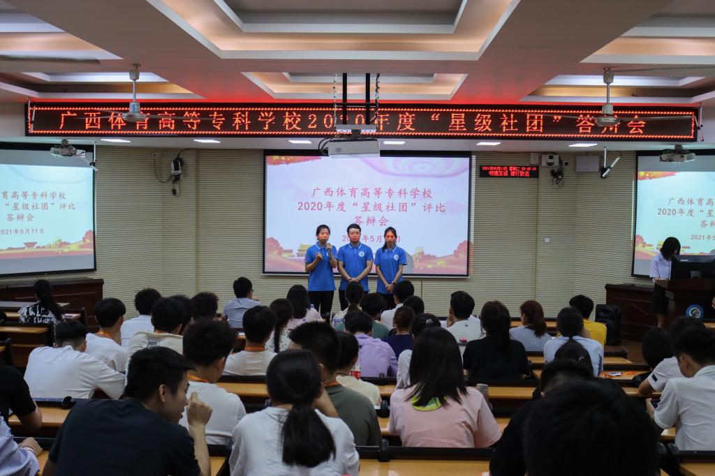 为庆祝中国共产党成立100周年,进一步推进校园精神文明建设,丰富社团文化,促进学生社团更好的发展。5月11日18:30在综合楼402教室举行爱体育电子官方网站2020年度“星级社团”评比答辩会,校团委为庆祝中国共产党成立100周年,进一步推进校园精神文明建设,丰富社团文化,促进学生社团更好的发展。5月11日18:30在综合楼402教室举行爱体育电子官方网站2020年度“星级社团”评比答辩会,校团委书记黎智达、副书记韦宛辰及各学院团委书记、学生社团联合会主席团出席答辩会并担任评委,学生社团联合会全体成员、各学生社团会员代表积极到现场观摩学习。