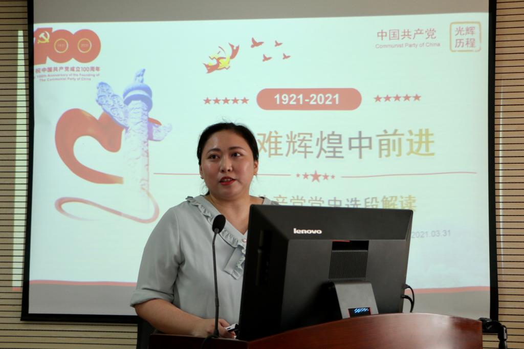 马克思主义学院秦臻老师以“在苦难辉煌中前进——中国共产党党史选段解读”为主题,把苦难辉煌的过去、日新月异的现在、光明宏大的未来贯通起来,给全体师生带来了一场内容丰富、精彩生动的党史学习教育课。
