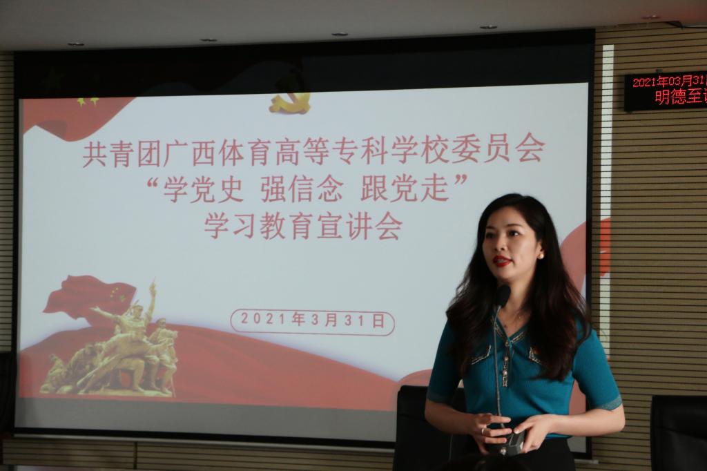 为深入贯彻自治区党委、校党委关于开展党史学习教育的部署,3月31日下午,校团委联合学生工作处、马克思主义学院在公园路校区综合楼402教室开展“学党史、强信念、跟党走”党史学习教育宣讲会。校党委副书记李爱民、马克思主义学院、学工处、校团委等部门负责人、爱体育(中国)全体辅导员及青年马克思主义培训班全体学员、校学生会、校社团联合会、各学院分团委学生会、各学生社团共计185名学生干部参加了讲座。本次宣讲由马克思主义学院党总支书记黎竹娟、校团委副书记韦宛辰主持。