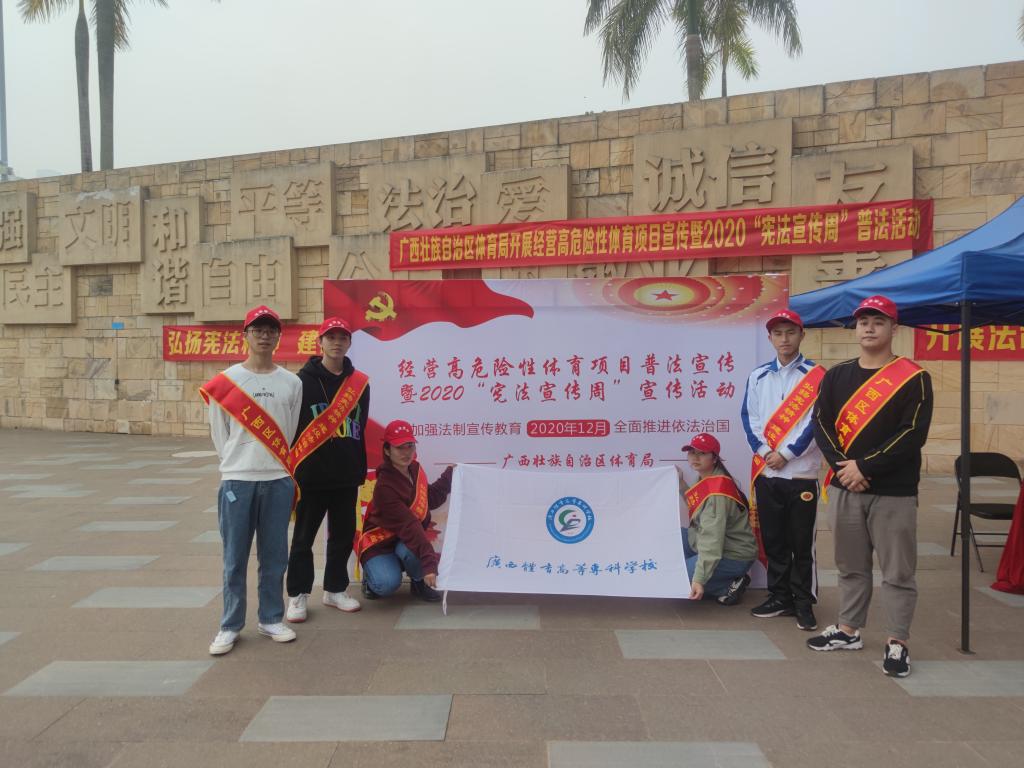 12月13日,应广西壮族自治区体育局的邀请,爱体育电子官方网站选派6名志愿者全程服务由区体育局主办的经营高危性体育项目普法宣传暨2020“宪法宣传周”宣传活动,并圆满完成各项任务。