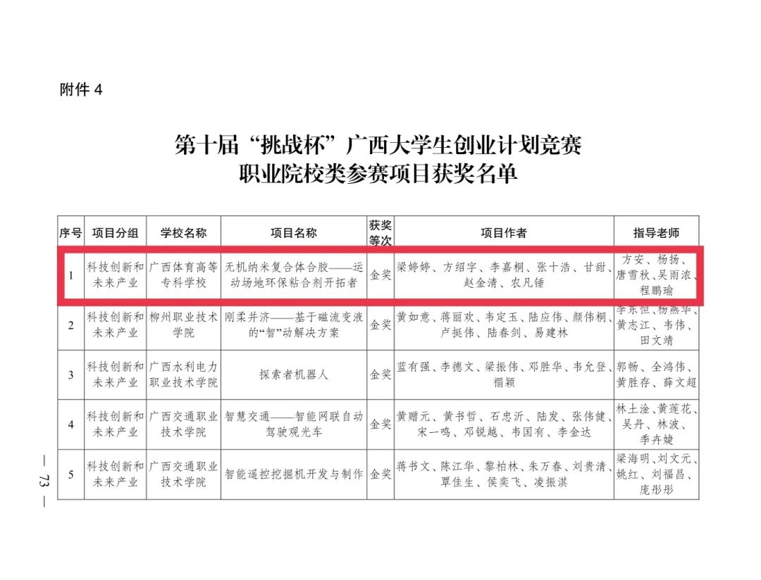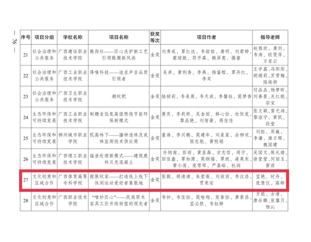 由共青团广西区委、自治区教育厅、自治区科协、广西学联共同主办的第十届“挑战杯”广西大学生创业计划竞赛获奖名单公布。爱体育电子官方网站在“挑战杯”广西大学生创业计划竞赛中再创佳绩,荣获3个金奖、2个银奖、9个铜奖。