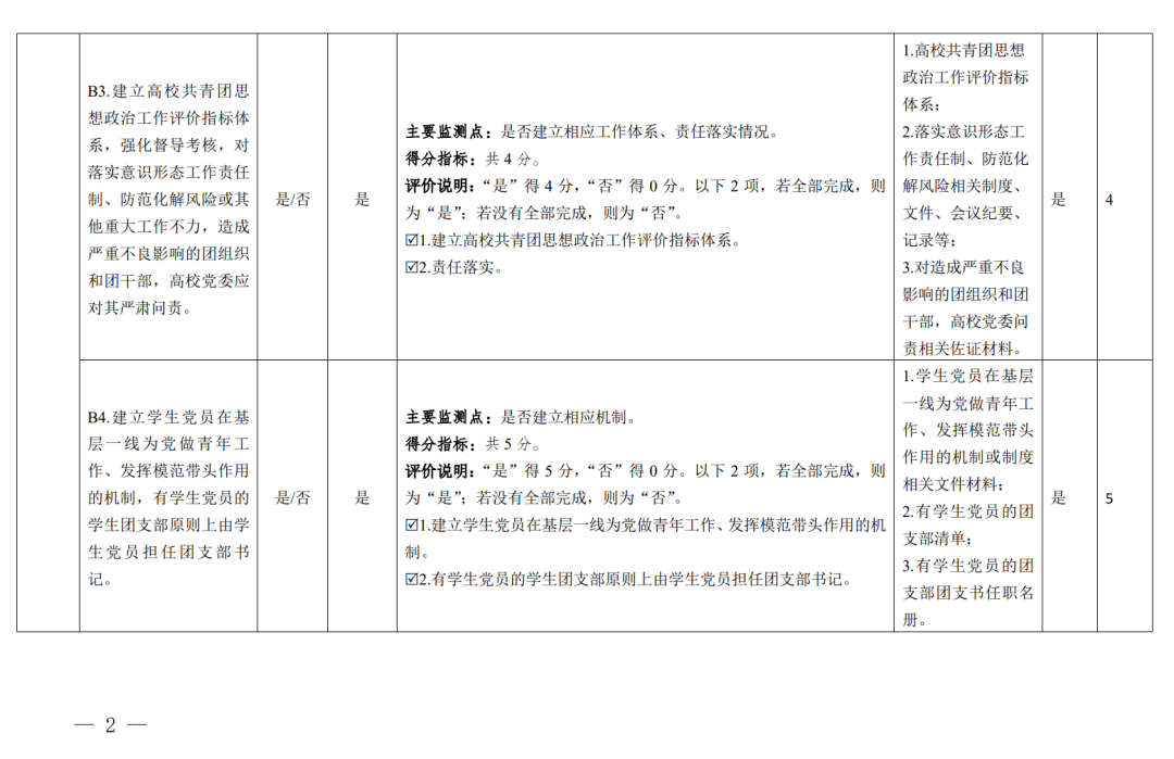 三是爱体育(中国)党委指导共青团制定《爱体育电子官方网站共青团思想政治工作评价指标体系》,严格按照《中共爱体育电子官方网站委员会扎实推进“清廉体专”建设的十条措施》强化督导考核,对团组织和团干部落实意识形态工作责任制、防范化解风险或其他重大工作做出了具体要求。