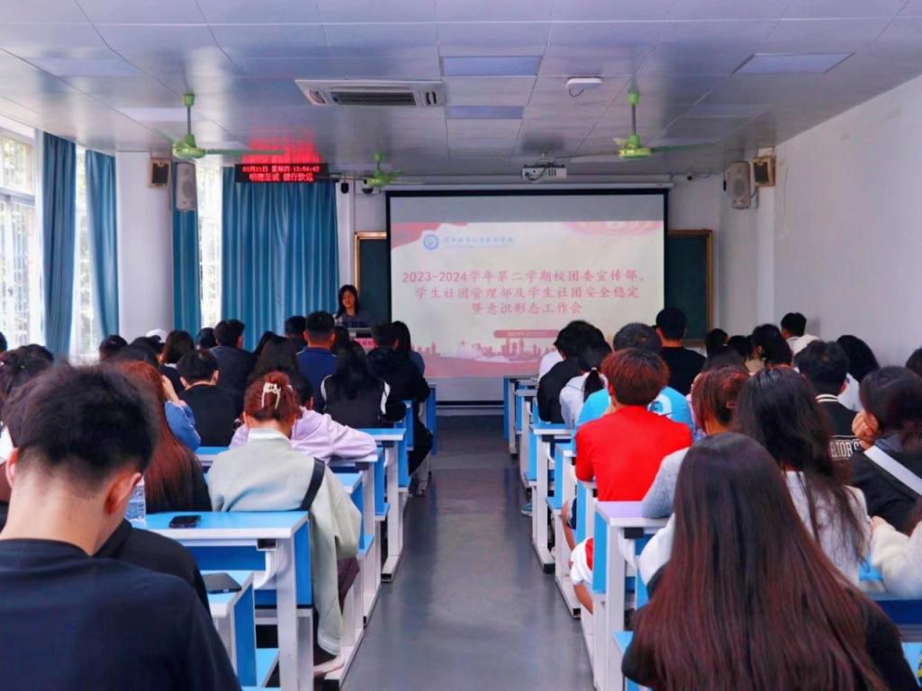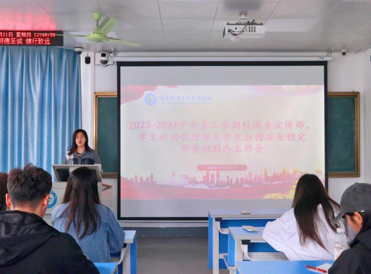 3月21日中午,爱体育电子官方网站团委在公园路校区综合楼302教室召开2023-2024学年第二学期宣传部、学生社团管理部及学生社团安全稳定暨意识形态工作会议。本次会议由学生社团管理部部长范程程老师主持,校团委宣传部、学生社团管理部全体工作人员及学生社团负责人参加会议。