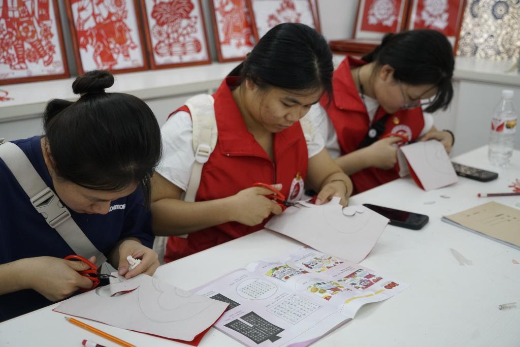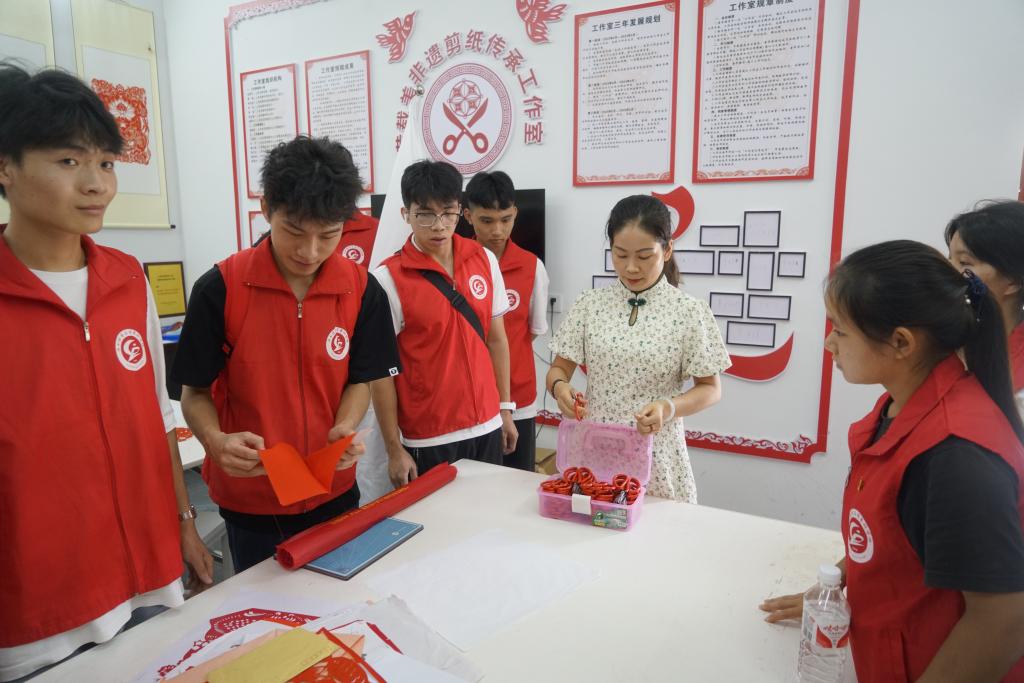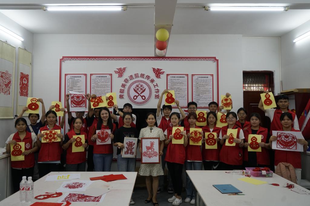 匠心对话——非遗剪纸传承人:传承团成员们还去拜访了非遗剪纸传承人黄载美老师,并怀着敬仰之心来到黄载美工作室。室内陈列的一幅幅精美剪纸作品,展现着民俗艺术的精妙绝伦和源远流长。在交流中,黄载美老师分享了她与剪纸艺术的不解之缘,传承团成员们认真倾听,深受触动。在黄载美老师的讲解和带领下,大家跟随着她一起创作、开展剪纸活动,一同感受其中的宁静与传统文化的魅力。