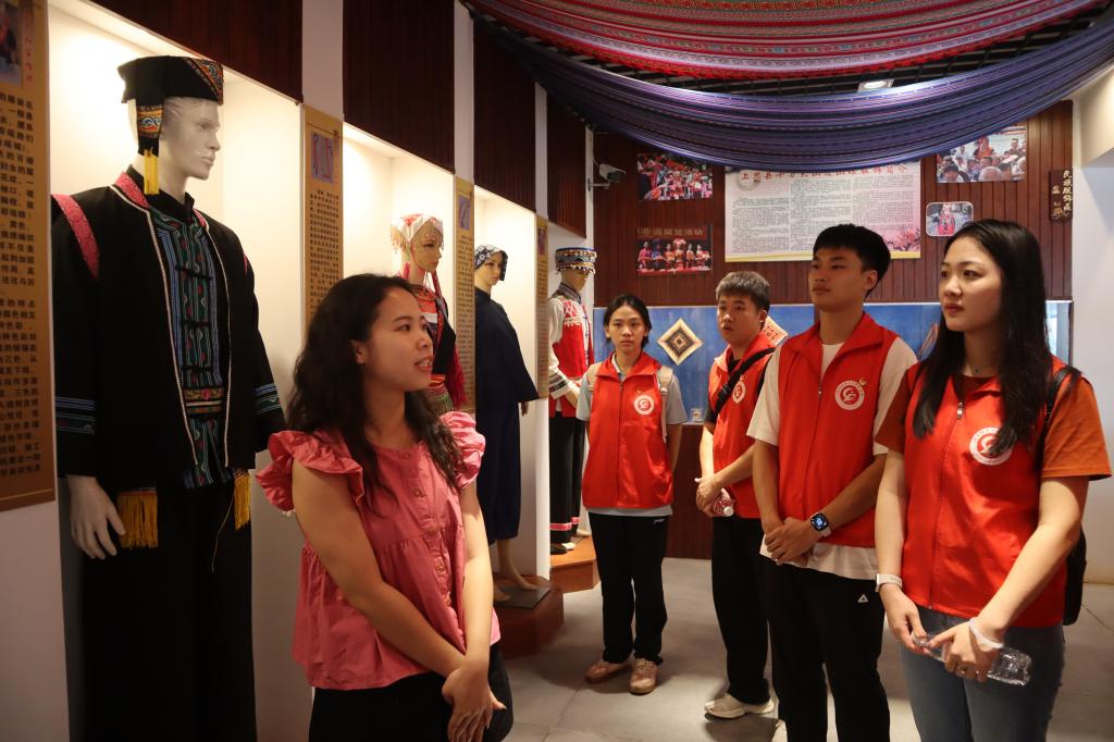 上思县南屏瑶族乡民族文化初体验:中华文化传承团满怀热情地来到了渠坤村瑶乡民族文化展厅。在展厅里,瑶族服饰颜色鲜艳,手工艺品精巧绝伦,宗教仪式道具古老又神秘。传承团成员们在听讲解的同时认真讨论着瑶族生活、饮食、劳作等内容,也从中联想到自己民族文化与瑶族文化的差异,引起了大家的共鸣与反思。