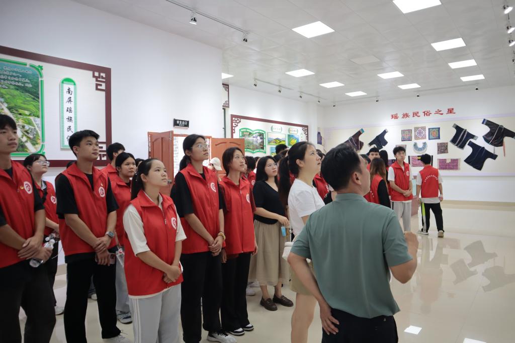 匠心对话——瑶族服饰非遗传承人:中华文化传承团成员们带着对传统文化的敬畏,深入瑶族村落,与瑶族服饰非遗传承人李先红老师交流,她向我们耐心的讲解每一件瑶族服饰从开始到制作结束的不易,每个细节都展现了瑶族人民的智慧与情感,足显其珍贵之处。在这一过程中,传承团了解到瑶族服饰制作的悠久历史、精湛技艺和深刻文化底蕴,更是有同学感叹:“这些瑶族服饰每一件都很精美,让我对瑶族的传统文化有了全新的认识和敬意。”