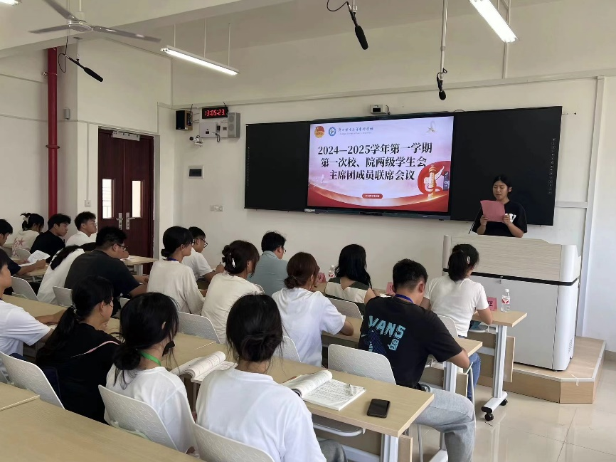 会上,何培书记以《关于加强新时代新征程学联学生会工作的实施意见》一文为题,向学生会骨干们开启新学期的“开学第一课”:一是学生干部应以政治引领为先,提升理论素养,继承传统文化,增强文化修养,倡导阅读,深化学习;二是推进“我为同学做实事”项目,以服务同学为核心,发挥桥梁作用,助力学习、就业和社会融入,促进同学全面发展;三是动员学生参与中国现代化建设,引导他们深入基层接受红色教育,参与青年统战工作,将个人发展与国家需求相结合,共同促进校园和社会的法制稳定;四是加强自身建设,优化部门运行,严抓骨干素质,以身作则,传播正能量,塑造服务同学的阳光形象。