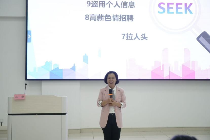 马静老师以“求职陷阱识别与防范”为主题,通过引用相关案例详细讲解了常见的十大就业陷阱:非法中介陷阱、入职收费陷阱、套路贷款陷阱、入职捆绑培训陷阱、猫腻合同陷阱等,深度剖析了目前社会各行业中存在的求职陷阱,并通过分析诈骗套路,告知同学们如何防范及应对此类陷阱,如何防诈骗及确保人身财产安全。