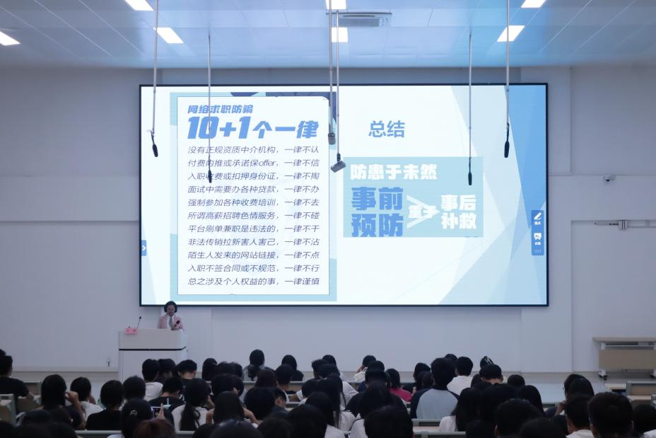 最后她向同学们强调,针对求职的各种各样陷阱,大学生要增强自我保护意识、法律意识,进一步学习了解《中华人民共和国劳动合同法》《中华人民共和国社会保险法》等相关法律规定,在就业过程中发生侵害自身权益的情况时,应采取合宜的方式,善于利用法律武器维护自身合法权益。