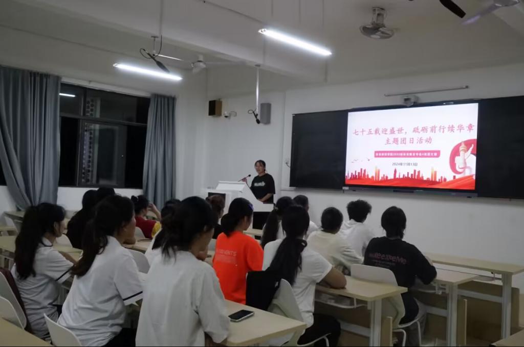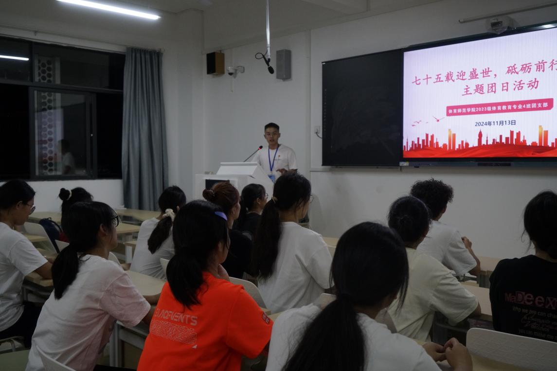 为庆祝中华人民共和国成立75周年,弘扬爱国主义精神,体育师范学院2023级体育教育专业4班团支部开展“七十五载迎盛世,砥砺前行续华章”主题团日活动。