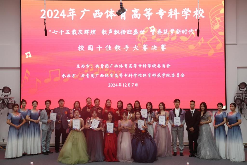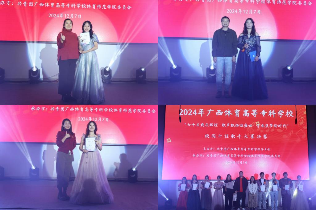 比赛过程中,选手们纷纷拿出自己的看家本领,用动人的歌声和深情的演绎,为观众带来了一场视听盛宴,每一首歌曲都充满了青春的气息和激情。经过激烈的角逐和评委们公正的评判,最终,体育师范学院2023级体育教育专业陈丽华获得冠军、体育管理学院2024级新闻采编与制作专业何懿琦获得亚军、体育管理学院2024级体育运营与管理专业吴恩奇获得季军!评委老师们为获奖选手颁发荣誉证书和奖杯,并对他们的出色表现表示热烈的祝贺。