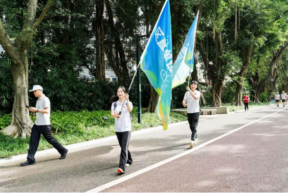 活动开始,志愿者迈着稳健的步伐高举旗帜一路同行,为长达6km的步道注入蓬勃活力,队伍如一条流动的蓝色长龙,穿梭于绿意盎然的步道间,每一步都踏出禁毒的决心与青春的铿锵