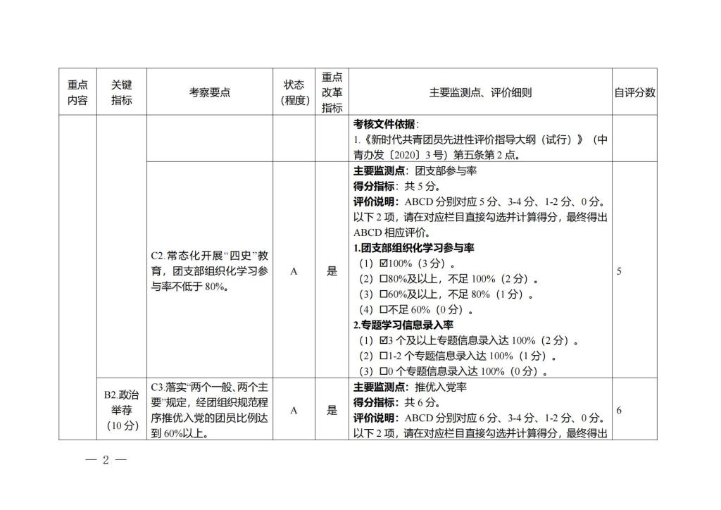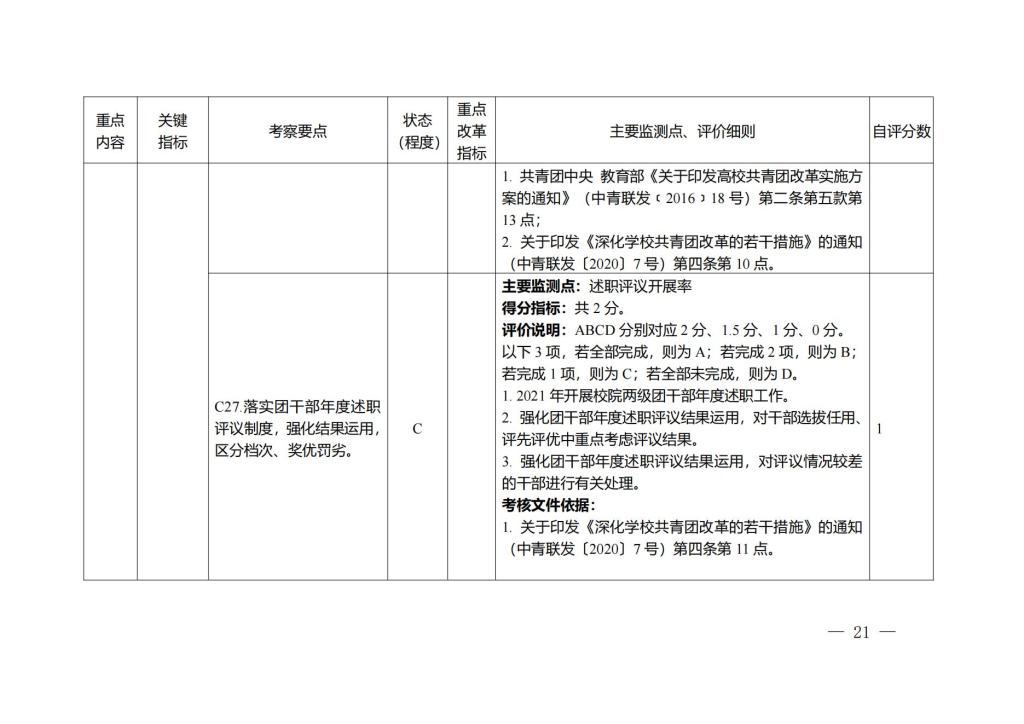 1.组织领导。爱体育(中国)党委将团的建设纳入高校党的建设总体格局同规划、同部署、同考核,在2021年第59次党委会上明确在爱体育电子官方网站对体育与教育学院、运动科学与健康学院、体育经济管理学院党组织书记抓思想政治工作和党的建设述职评议考核指标中将考核评议指标中增加抓共青团建设内容,并明确考核分值占比不低于10%。2021年爱体育(中国)党委专项研究共青团工作4次,由爱体育(中国)党委李爱民副书记分管、邱团副校长联系共青团工作,做到有指导、有安排、有支持。