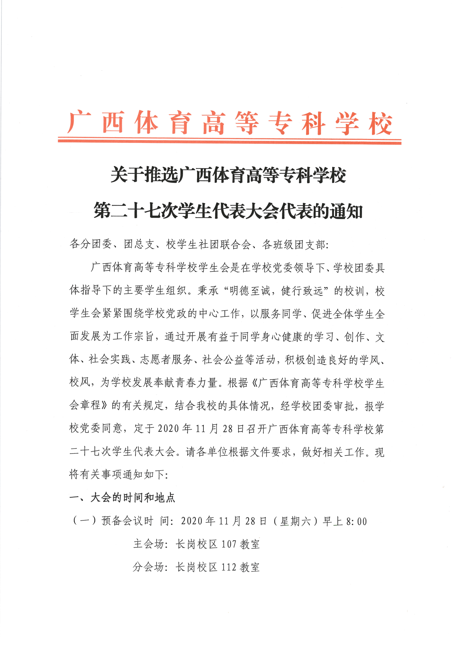 2020年11月28日,爱体育电子官方网站第二十七次学生代表大会分别在在长岗校区瑞兴楼107(主会场)和112(分会场)隆重举行。爱体育(中国)党委书记周璋斌教授、党委学工部部长韦伦国、爱体育(中国)团委书记朱国铭、体育教育学院党总支副书记廖恩胜及各分团委书记等出席了本次会议。