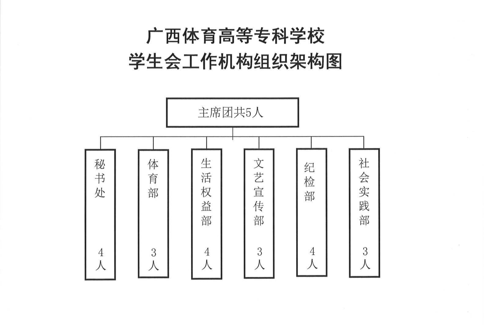 (一)校级学生会工作组织架构为“主席团+工作部门”模式。工作人员原则上不超过60人,其中主席团成员不超过5人,每个工作部门负责人不超过3人。校学生会主席团不设主席、副主席,设执行主席,集体负责学生会重大事项。执行主席由主席团成员轮值担任,以学期为一个轮值周期,负责召集会议、牵头日常工作。工作部门设秘书处、文艺宣传部、生活权益部、纪检部、社会实践部、体育部6个工作部门。