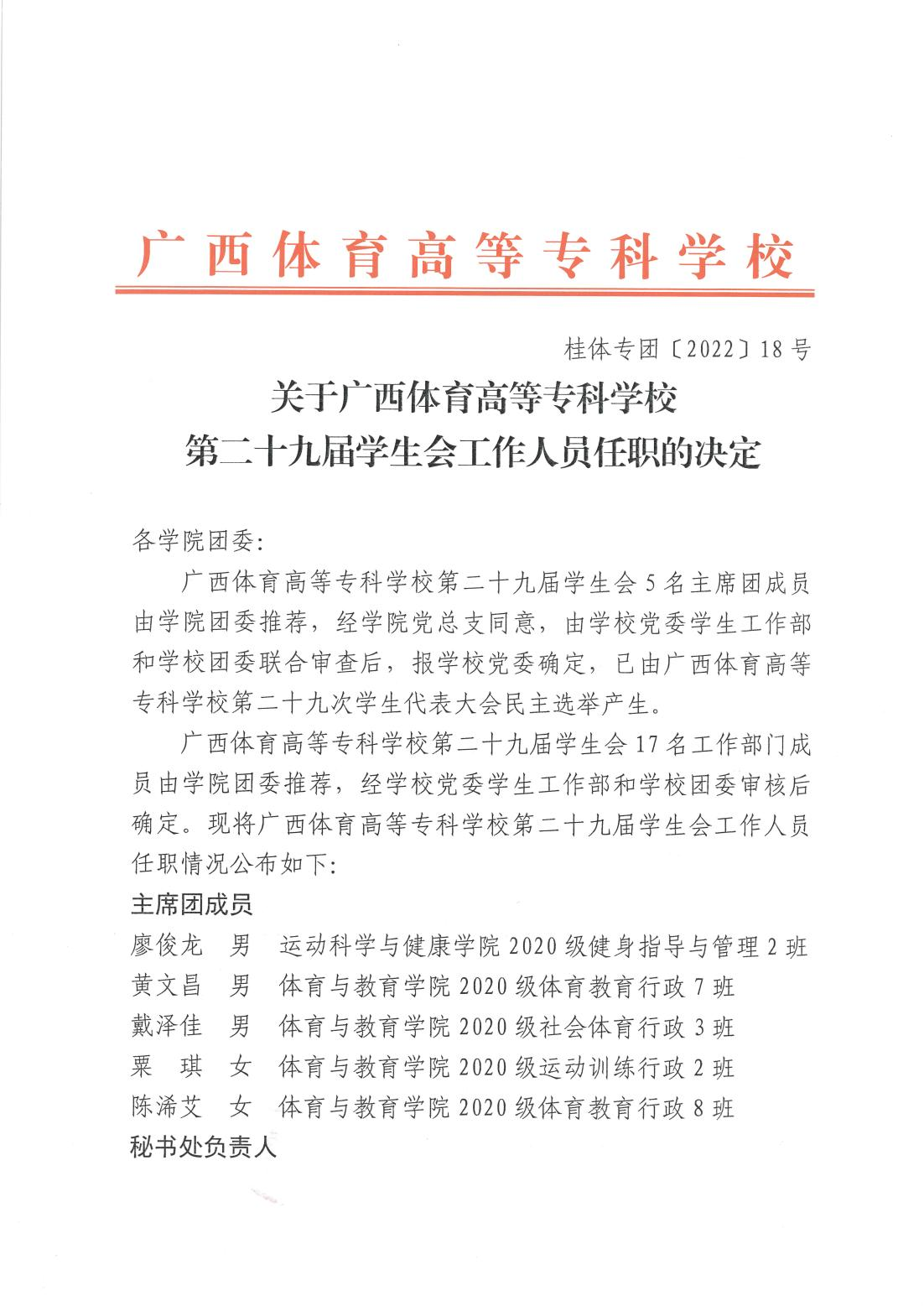 关于爱体育电子官方网站第二十九届学生会工作人员任职的决定