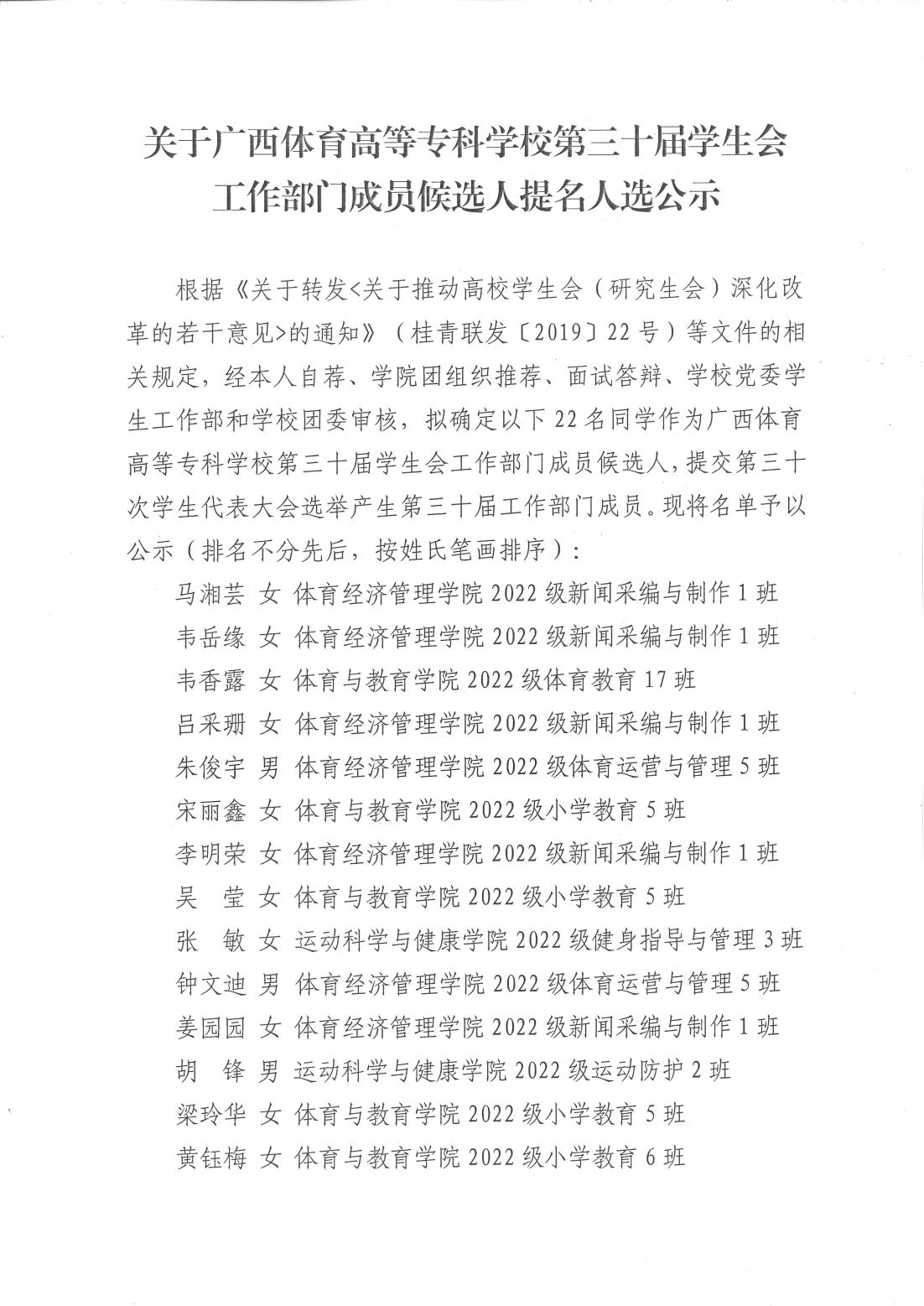 关于爱体育电子官方网站第三十届学生会工作部门成员候选人提名人选公示