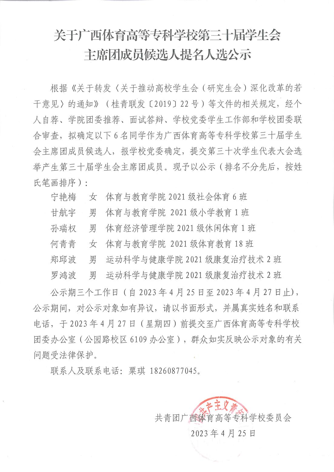 关于爱体育电子官方网站第三十届学生会主席团成员候选人提名人选公示