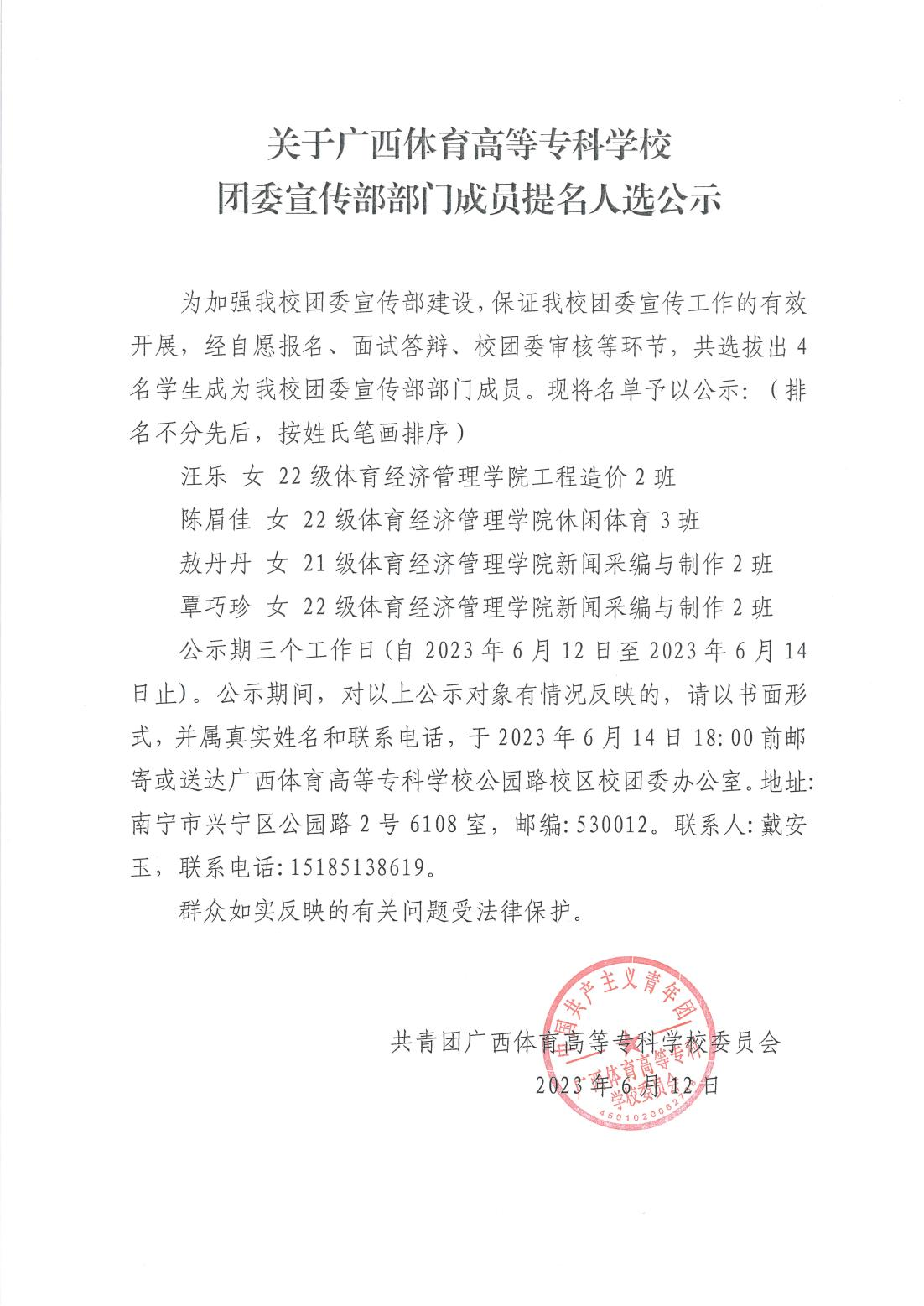 关于爱体育电子官方网站团委宣传部部门成员提名人选公示