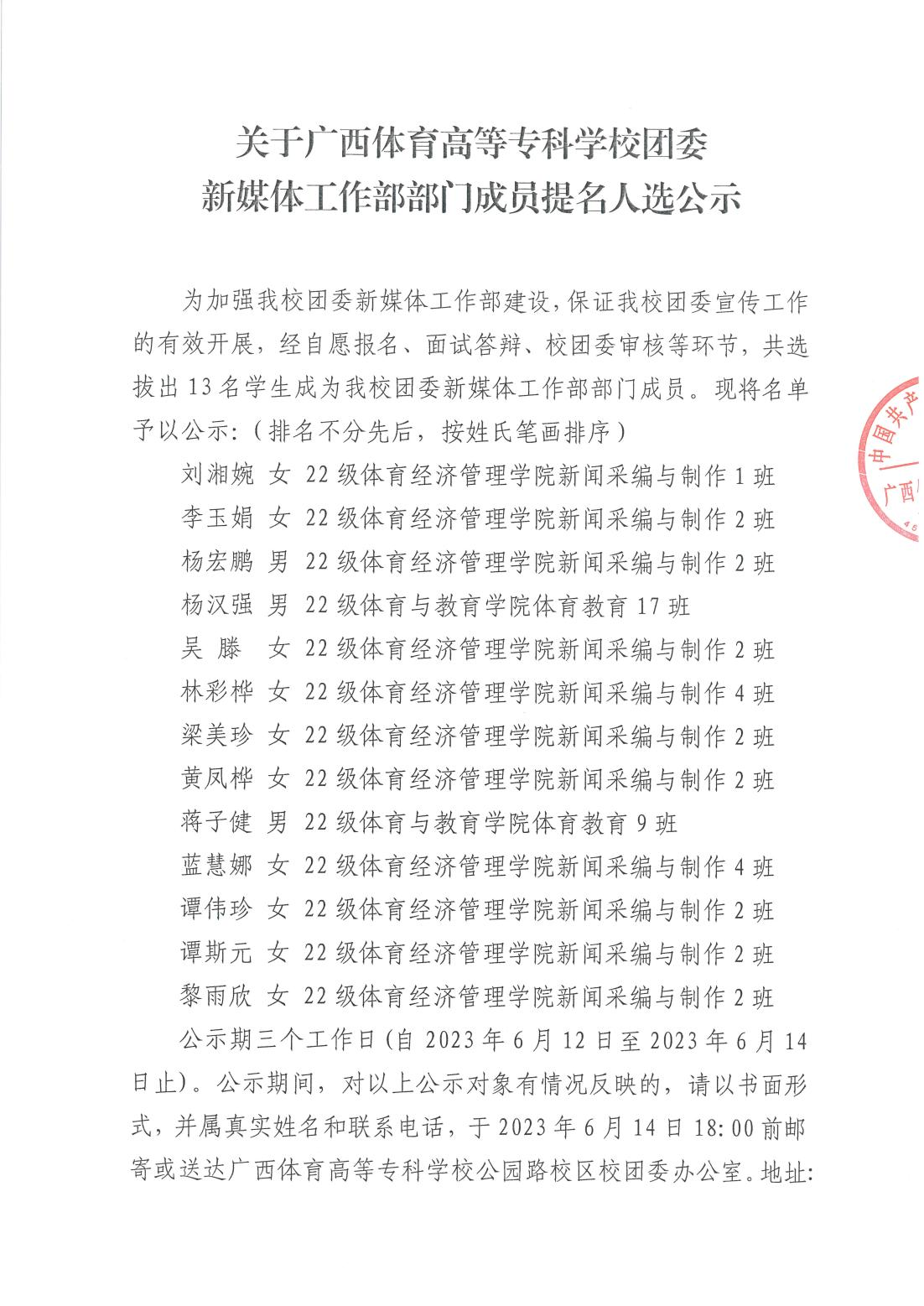 关于爱体育电子官方网站团委新媒体工作部部门成员提名人选公示