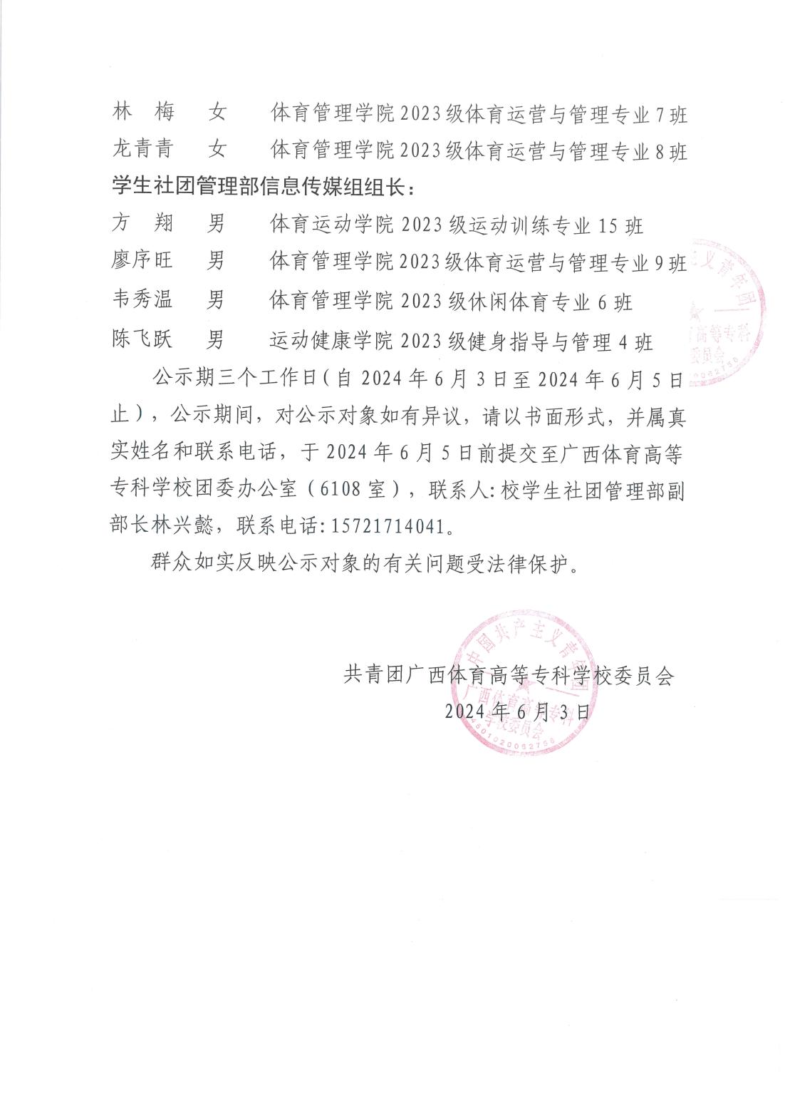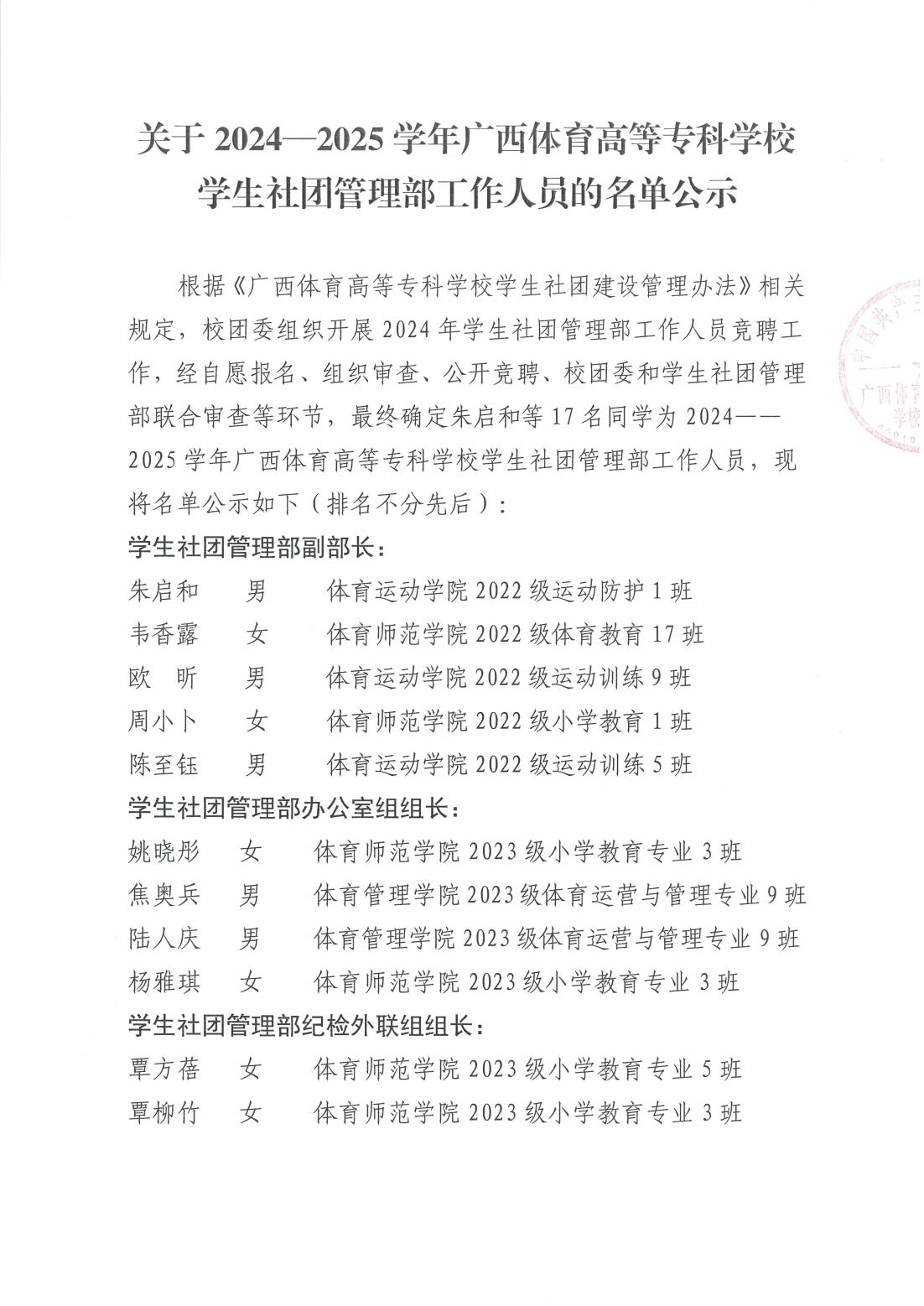 关于2024—2025学年爱体育电子官方网站学生社团管理部工作人员的名单公示