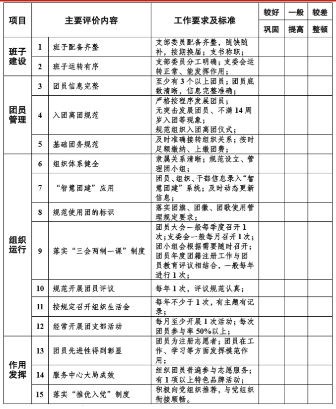 注:1. 团支部对照本表弱项加强整顿,评价较好的项目要巩固,一般的要提高,较差的要整顿。