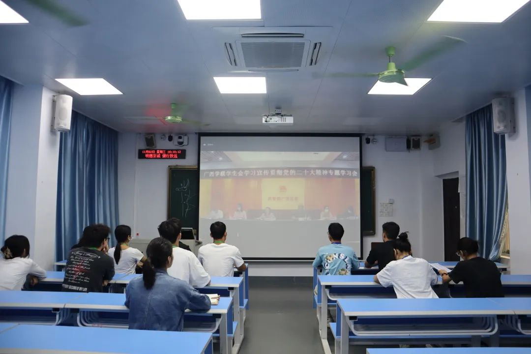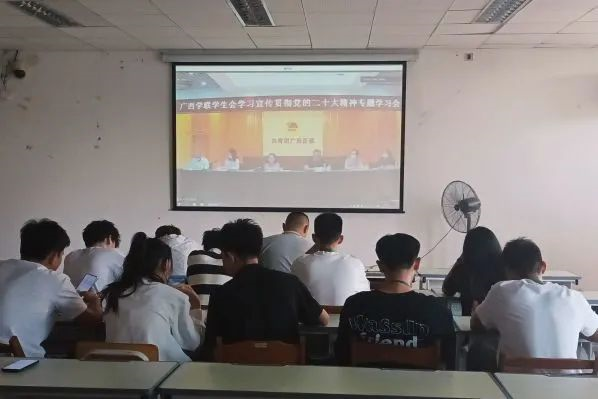 11月2日下午,广西学联学习宣传贯彻党的二十大精神专题学习会在共青团大厦16楼会议室召开,本次学习会采用线上线下相结合的形式进行,爱体育电子官方网站团委组织了校院两级学生会全体工作人员在公园路校区6008教室集中学习习近平总书记的重要讲话和大会各项文件精神。