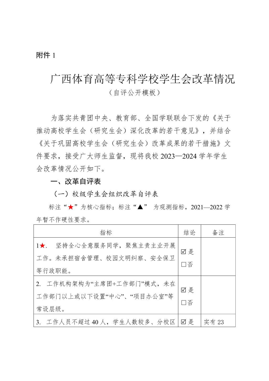 为落实共青团中央、教育部、全国学联联合下发的《关于推动高校学生会(研究生会)深化改革的若干意见》,并结合《关于巩固高校学生会(研究生会)改革成果的若干措施》文件要求,接受广大师生监督,现将爱体育电子官方网站2023—2024学年学生会改革情况公开如下。